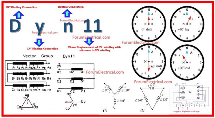 - ตัวเลข (Clock Notation): บอกมุมต่างเฟสโดยเปรียบเทียบกับหน้าปัดนาฬิกา (1 หน่วย = 30 องศา)